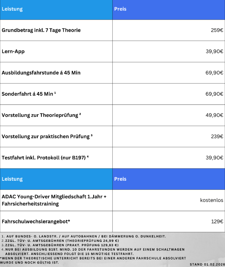 Wir setzen auf Tranzparenz und faire Preise. Hier erfährst du genau, welche Kosten auf dich zukommen - ohne versteckte Kosten. So kannst du dich voll und ganz auf deine Fahrausbildung konzentrieren.